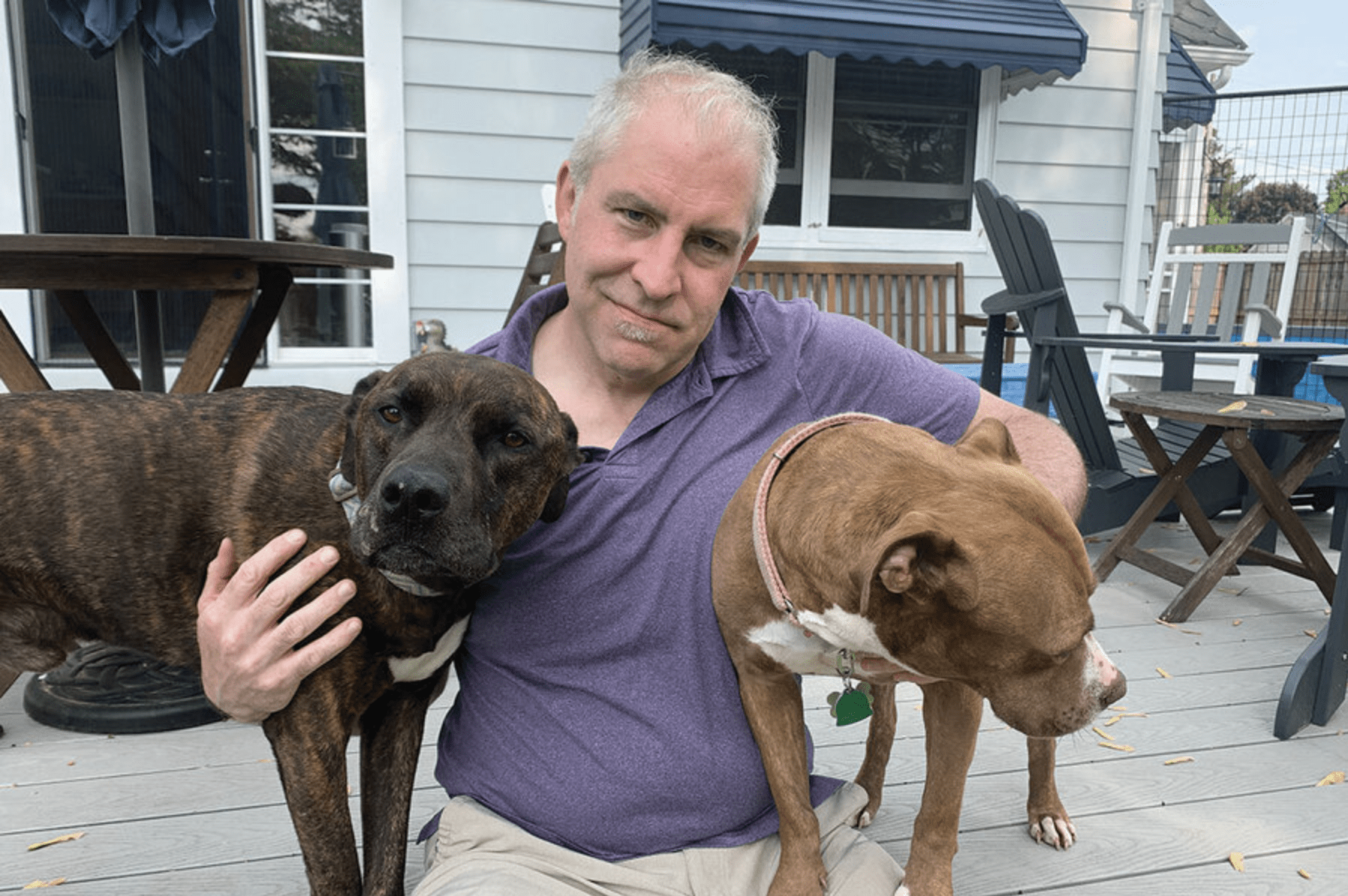 “You want to be sure there’s accountability, [but] is that a natural thing or is that controlling, white-supremacist patronizing, [even if] the intent is not racist?” – Ross Yednock, with dogs Mitt (left) and Bella, who rewrote his will to give all his assets to a faith-based reparations organization
