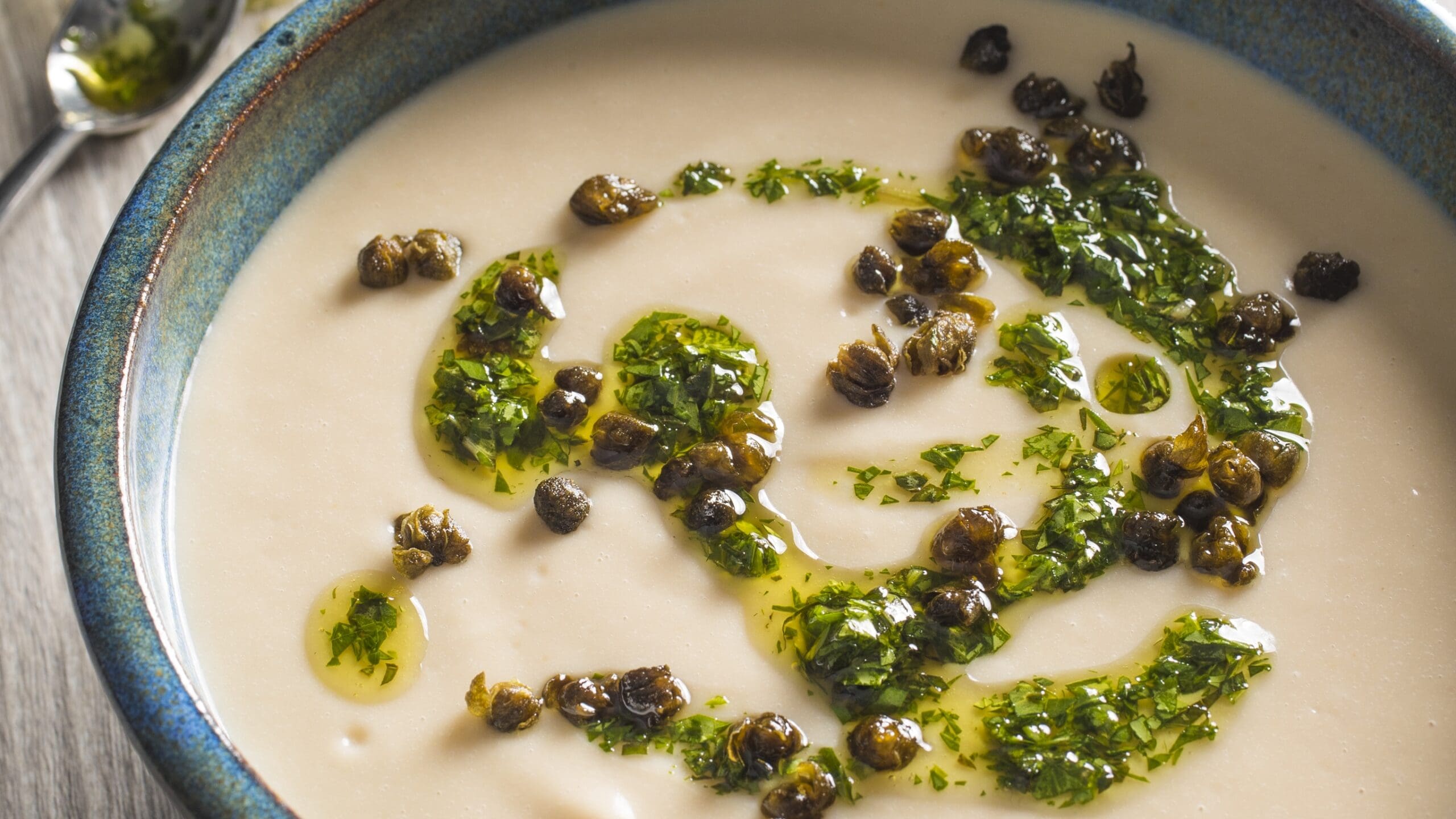 Creamy White Bean Soup with Herb Oil and Crispy Capers
