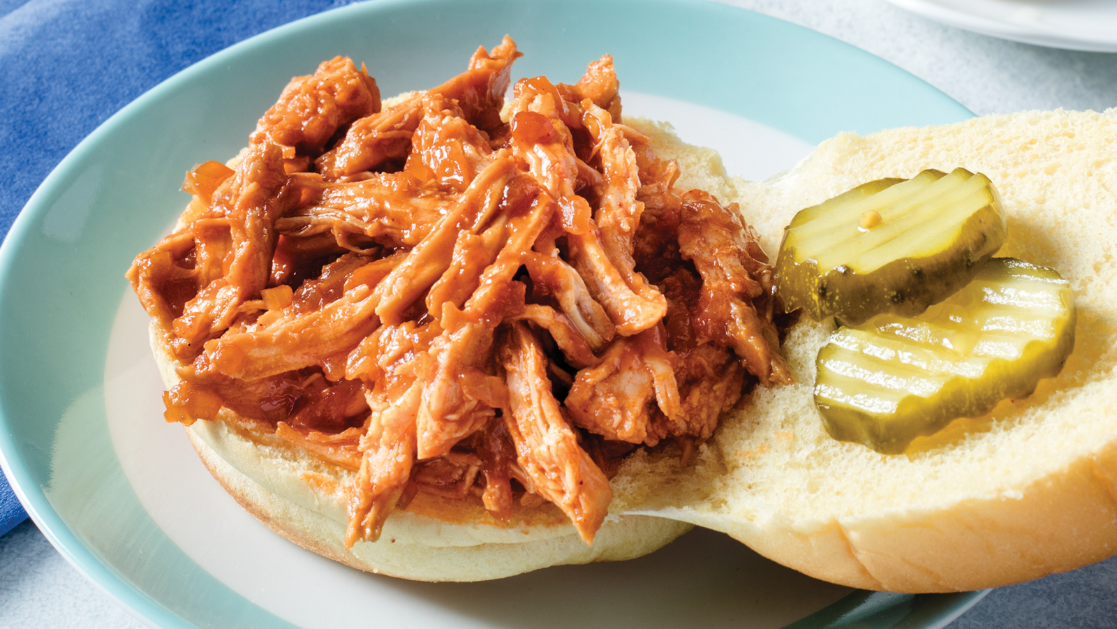 6. Heat chicken over medium heat until warmed through, 1 to 2 minutes. Evenly divide shredded chicken between hamburger buns. Top with pickle chips.