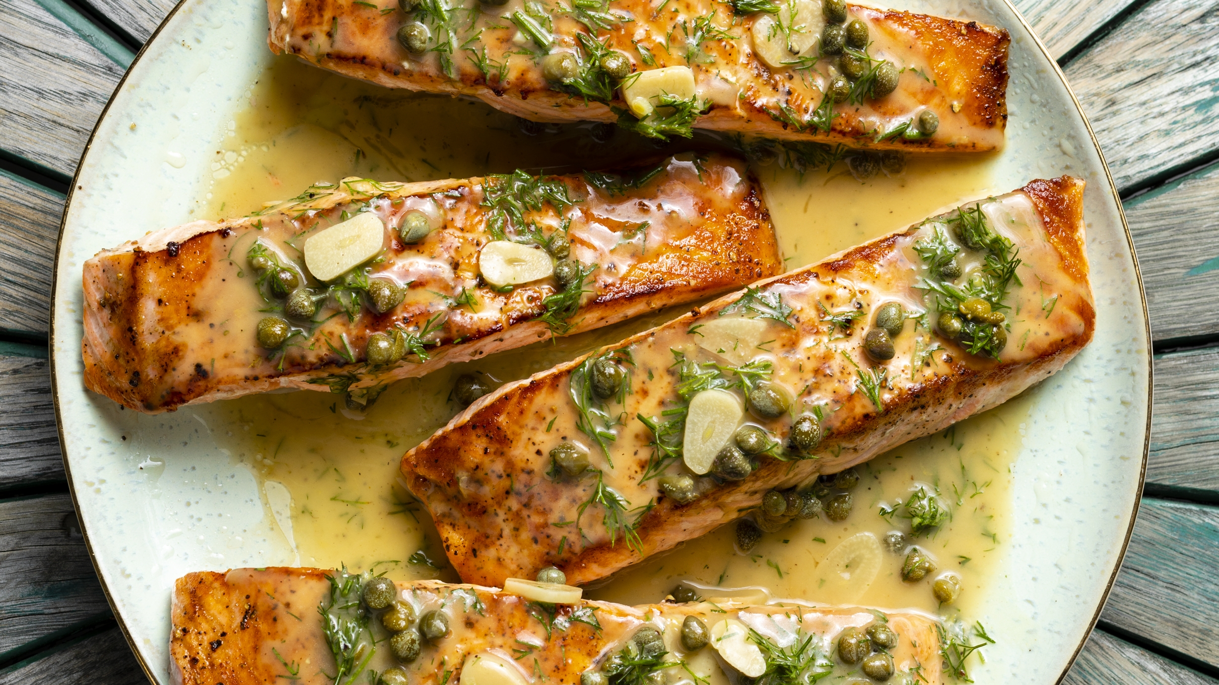 Piccata sauce is a simple but powerful mix of lemon, capers, white wine and butter. This tangy, bold sauce is a great match (and foil) for salmon's rich, full flavor.