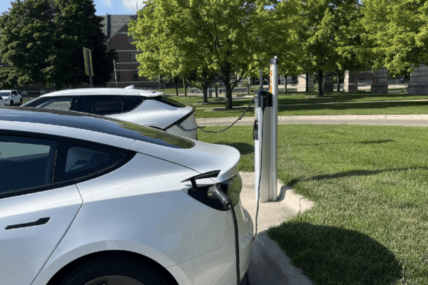 Electric vehicles recharging at the parking grounds near the International Center at Michigan State University in East Lansing. Photo by…
