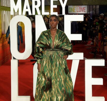Lashana Lynch attends the UK Premiere of Bob Marley – One Love. Photos by Antony Jones Getty Images for Paramount…