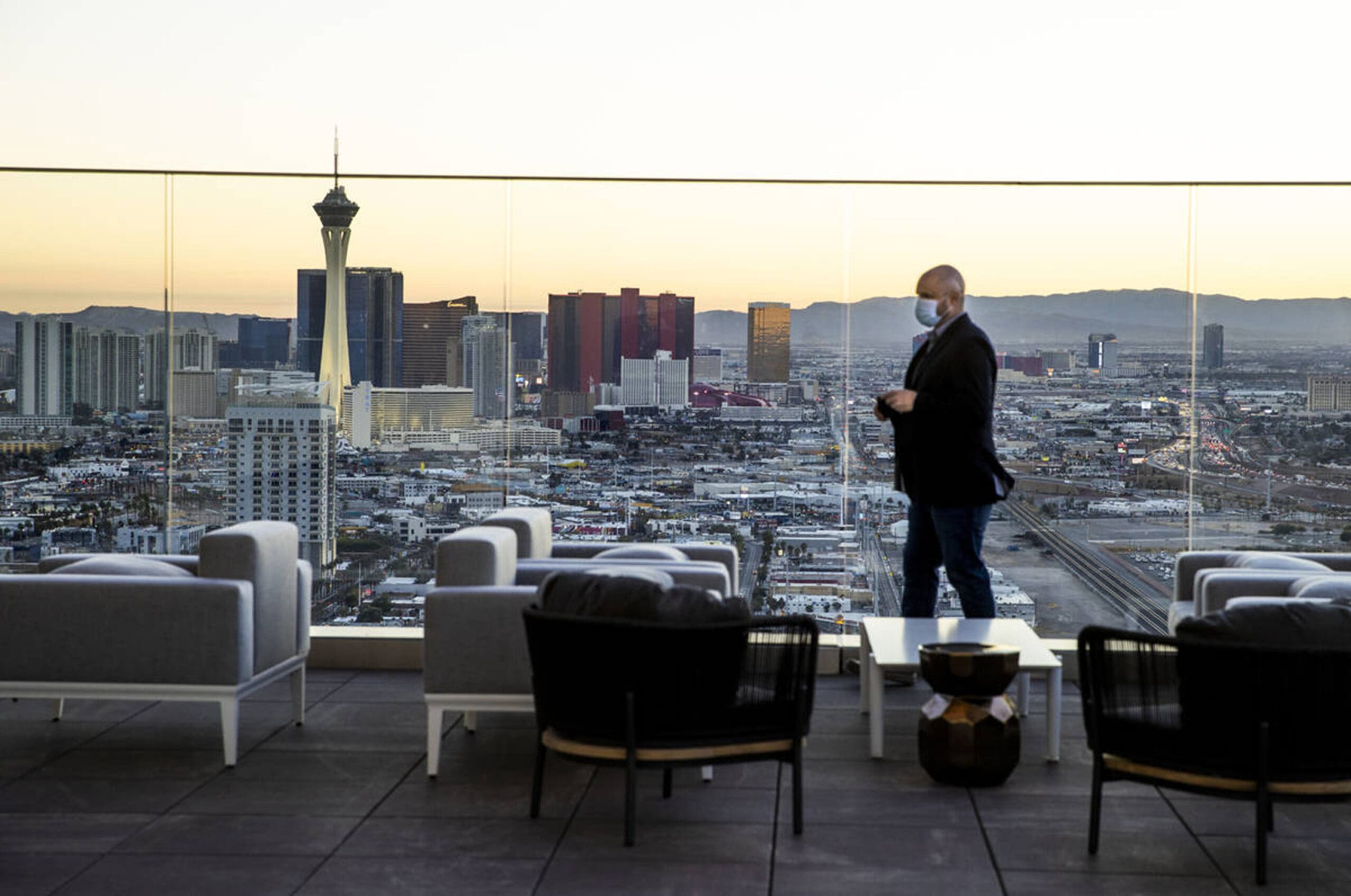 The sun sets on the city viewed from the outside deck within the Legacy Club at Circa on Dec. 22, 2020, in Las Vegas. (L.E. Baskow/Las Vegas Review-Journal/TNS)