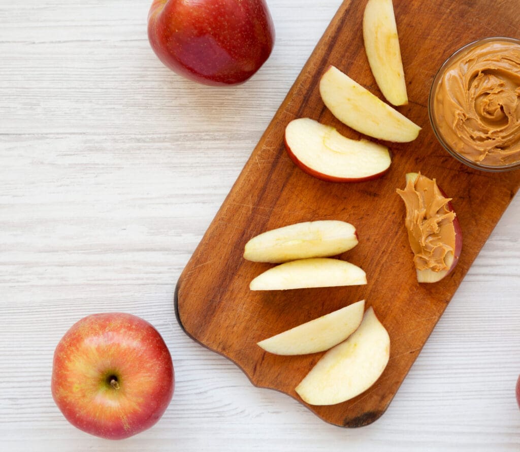 Slices of apple smeared with swirls of peanut butter.