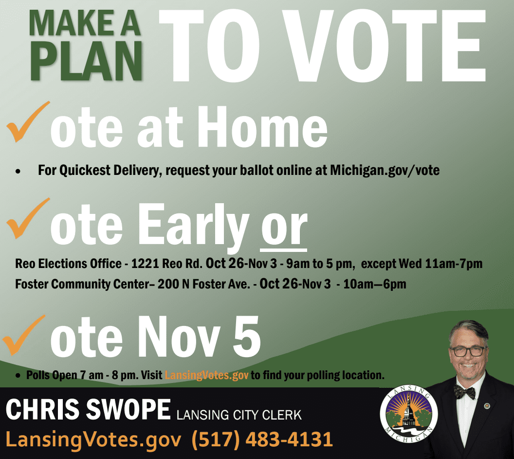 As an alternative to Reo Elections Office, voters can come to Lansing City Hall, 124 West Michigan Ave., to pick up an absentee ballot in-person. For more information, visit www.LansingVotes.gov or call (517) 483-4131.