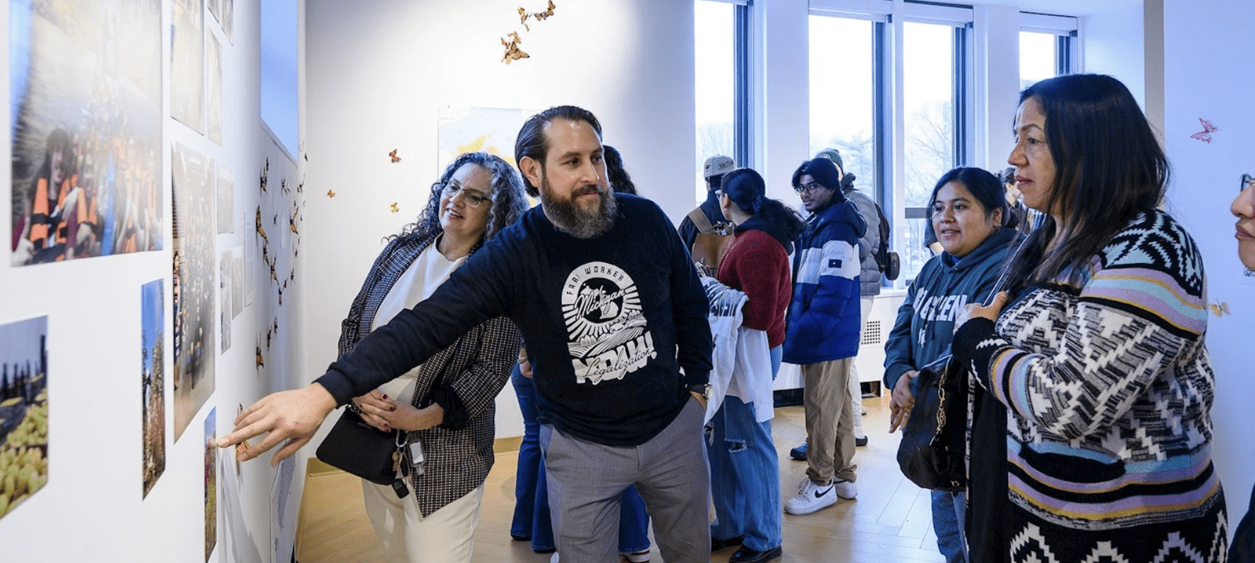 Throughout the exhibition, QR codes are displayed, linking to migrant farmworker stories from recognizing the successes of MSU’s bilingual agriculture program supporting first-generation Latino/a farmers to graduates like Dayana Villagran, who went from climbing a ladder to pick apples every day to breaking barriers as a woman mechanical engineer at General Motors. These and other stories are placed around the exhibition on butterfly-adorned walls.