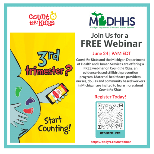 To help reduce infant mortality, the MDHHS Division of Maternal and Infant Health is partnering with Count the Kicks, an evidence-based stillbirth prevention program, to educate expectant parents and providers about the importance of paying attention to baby’s movements in the third trimester of pregnancy. The following no-cost resources are available to expectant parents and providers: