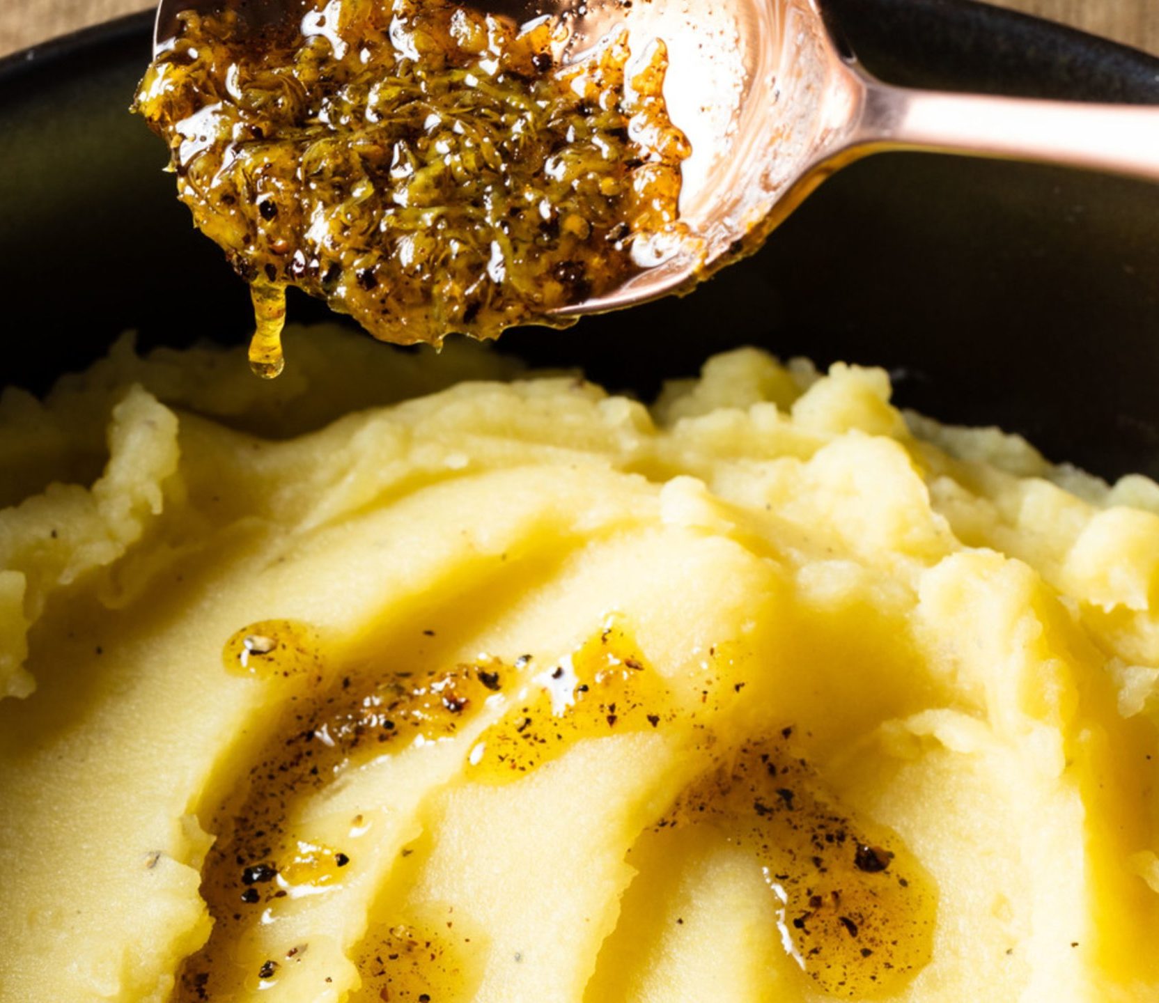 4. Transfer potatoes to a serving bowl and use the back of the spoon to create divots on the surface. Drizzle with reserved oil mixture. Serve.